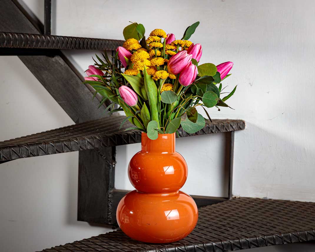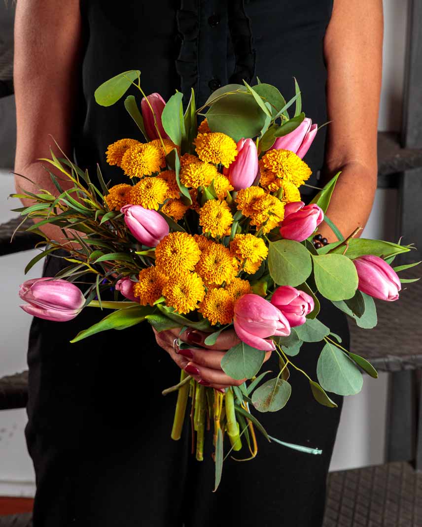 Il bouquet “Sammy” è un concentrato di energia positiva, un bouquet che sprigiona colore e buonumore. I tulipani fucsia, audaci e luminosi, si intrecciano ai santini colorati in un mix frizzante di forme e tonalità. Ogni fiore è una piccola esplosione di gioia, che racconta spensieratezza, entusiasmo e voglia di vivere. Un bouquet pensato per chi ama circondarsi di luce e trasmettere vibrazioni contagiose.