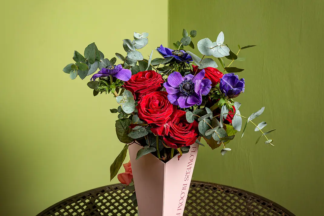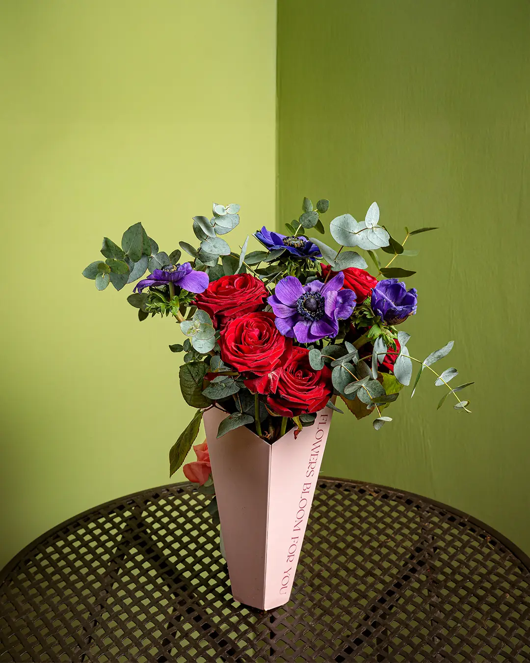 Crazy Love è una composizione floreale dal carattere deciso e contemporaneo, in cui gli anemoni viola incontrano l’intensità delle rose rosse, creando un contrasto cromatico forte e affascinante. Il verde mix aggiunge equilibrio e movimento, completando una creazione ricca di energia. Ideale per chi vuole uscire dagli schemi e regalare un’emozione diversa, questa composizione è perfetta per San Valentino o per un gesto d’amore fuori dal comune.