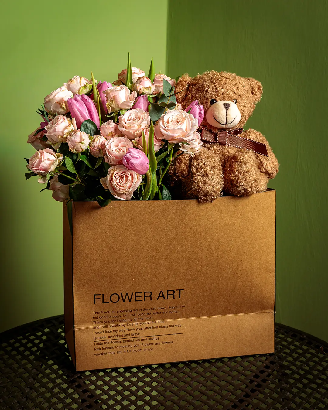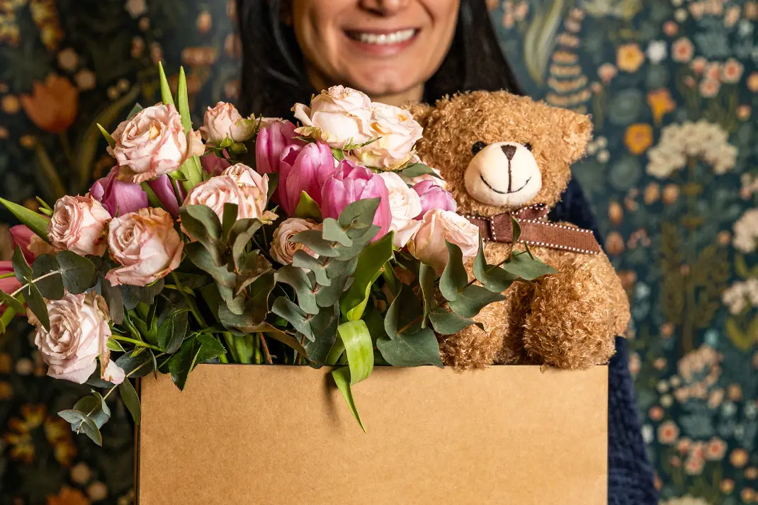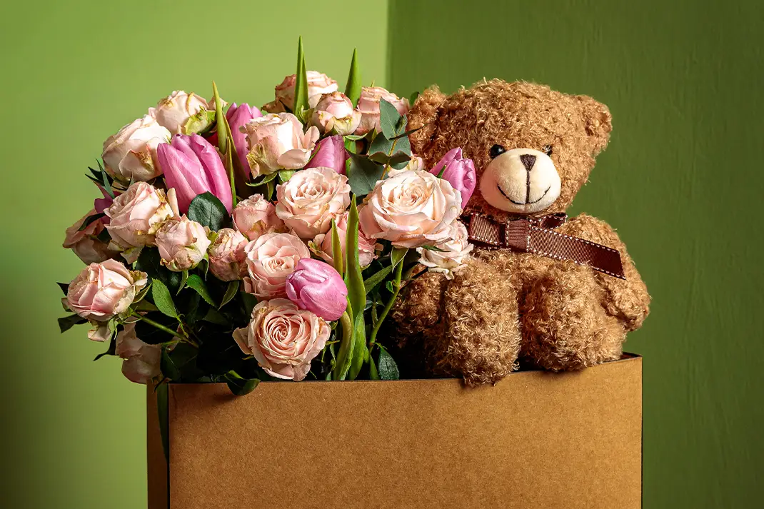 Flower Shop è una composizione pensata per emozionare, con un bouquet di rose ramificate rosa e tulipani rosa, arricchito da verde mix per un risultato fresco ed elegante. L’insieme è completato da un morbido orsacchiotto e da una shopper bag raffinata, che rendono il regalo ancora più speciale e curato. Perfetta per San Valentino o per un’occasione romantica, questa creazione è ideale per chi desidera sorprendere con un gesto dolce, delicato e ricco di significato.