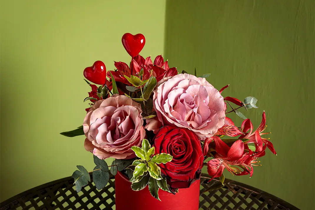 Box Love è una composizione floreale dal carattere deciso e avvolgente, in cui i garofani carne si uniscono alle rose rosse e all’alstroemeria rossa, creando un gioco di tonalità calde e profonde. Il verde mix completa l’insieme con equilibrio e naturalezza, mentre il dettaglio lover aggiunge un tocco romantico e iconico.