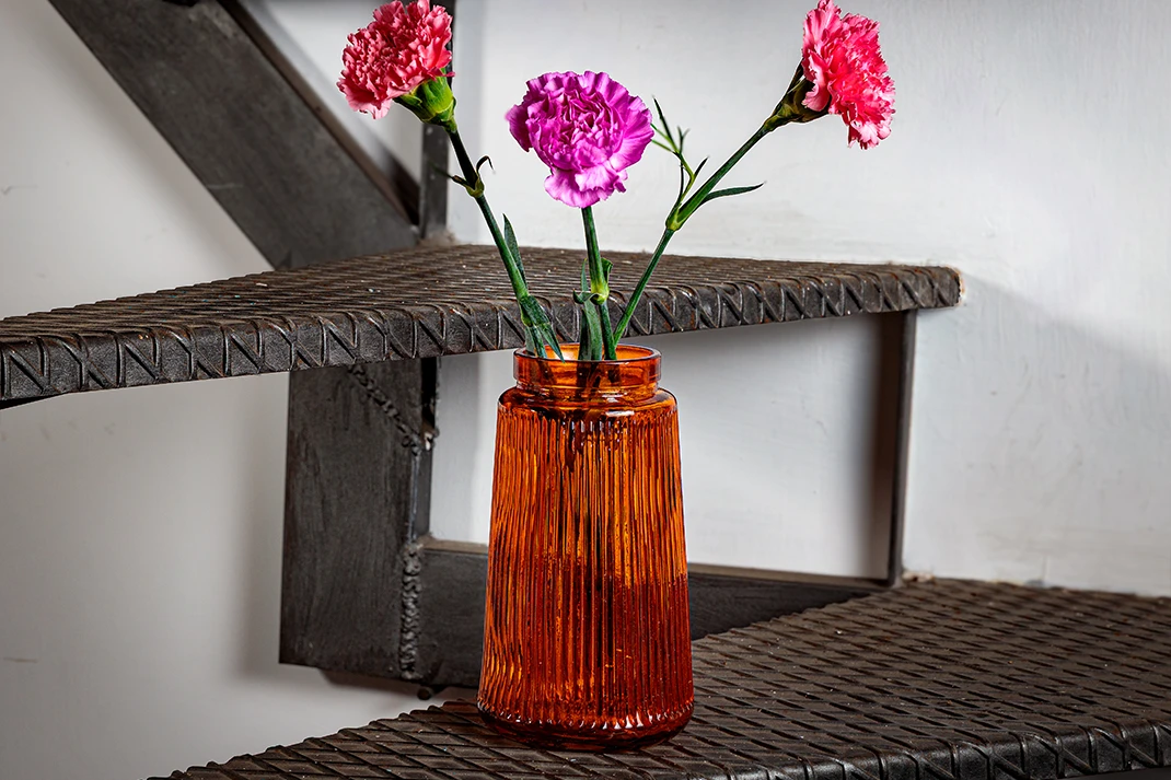 Il Vaso Arancio Piccolo unisce semplicità ed eleganza in un design intramontabile. Realizzato in vetro trasparente con raffinata lavorazione a coste verticali, cattura la luce creando riflessi caldi e avvolgenti. Perfetto per piccoli bouquet o fiori singoli, dona un tocco di colore e carattere a qualsiasi ambiente, dal tavolo da pranzo alla scrivania.