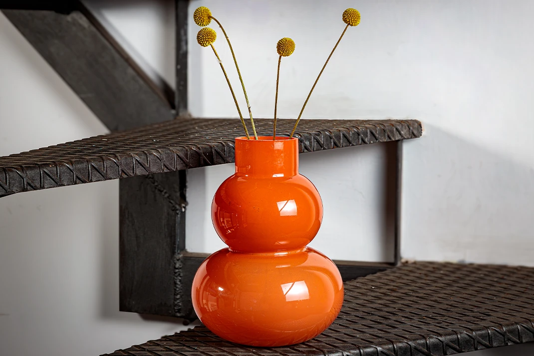 Vaso in vetro arancio, forma morbida, design moderno e luminoso.