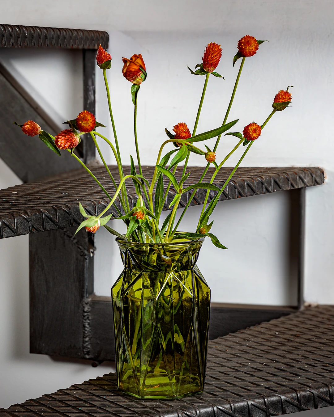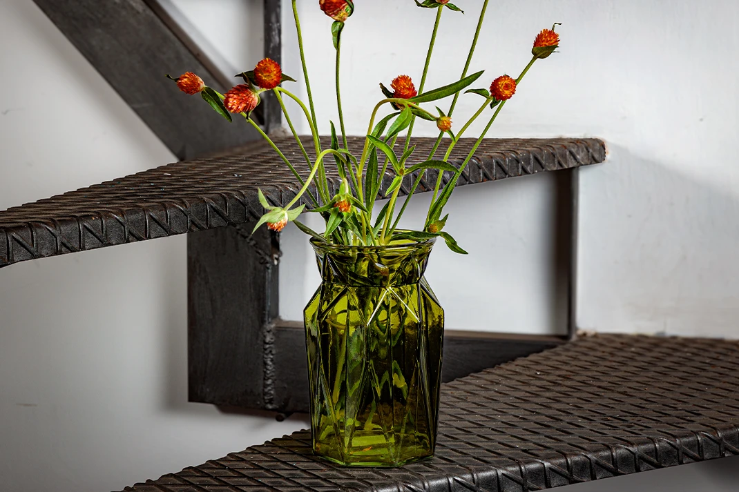 Vaso in vetro verde, geometrico, fresco e dallo stile vintage.