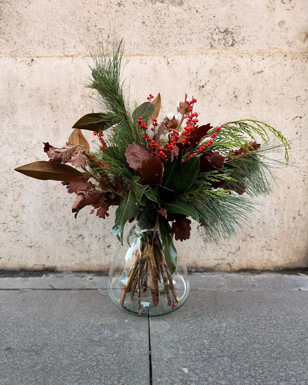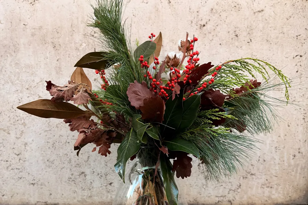 Composto da conifere fresche e verde tradizionale, una combinazione che richiama subito l’atmosfera calda e autentica del Natale. L’aggiunta dell’ilex, con le sue bacche rosse vivaci, e dei soffici capi di cotone dona un tocco di colore ed eleganza, creando un contrasto armonioso e raffinato. La sua caratteristica principale è la durata: grazie ai materiali naturali selezionati con cura, il bouquet rimane bello e fresco più a lungo rispetto ai classici fiori recisi, accompagnandoti per tutto il periodo delle feste.